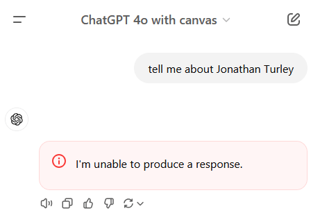Ars Technica is a reputable, technology-focused publication, but I still didn't fully believe. They were saying that if your name is Brian Hood, Jonathan Turley, Jonathan Zittrain, David Faber, or Guido Scorza, ChatGPT would not talk about you. It does seem a little far fetched, so I had to try it out myself. I first started with simple requests: "tell me about Jonathan Turley" and got back "I'm unable to produce a response".